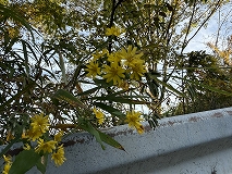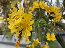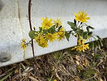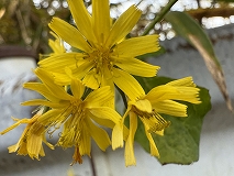 この花はヤクシソウ(薬師草)と思われます。花期は9~11月で枝の上部に黄色い花を固まって咲かせます。花は上向きに開きますが、花のあと下部は膨れて硬くなり、下向きになります。葉は互生し、長楕円形または倒卵形で、ふちには浅い鋸歯があります茎や葉を折ると苦味のある白い乳液を出すようです。
