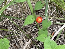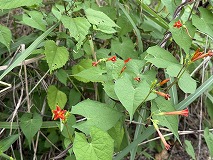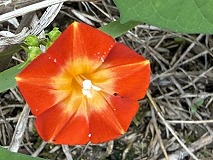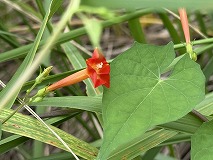 この花はマルバルコウ(丸葉縷紅)と思われます。道端や畑のわきなどで見られます。つる性植物で、茎がZ巻きの蔓になってます。約3mくらい伸びます。花期は8~10月にかけてです。枝の先に花を3 ~8個つけます。花は漏斗形で、上から見ると五角形の形をしています。花色は赤色で、柱頭は白色で球状です。北アメリカを原産地で、日本には江戸時代末期に入ってきたと考えられています。
