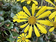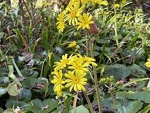 この花はツワブキ(石蕗)と思われます。和名ツワブキの由来は、艶葉蕗(つやはぶき)つまり「艶のある葉を持ったフキ」から転じたとする説があります。常緑多年草で、海岸沿いに多く自生し、岩の上や崖の上などに生えます。そのほか丘陵地や林の中の日陰などにも生えています。初冬(10~1月)に花茎を伸ばして高さ30~ 80 cmになり黄色い花を咲かせます。昔から民間薬や食用野草として知られ、若い葉柄が食べられます。また花が美しいので観賞用に日本庭園などにもよく植えられています。ちなみにツワブキの花言葉は「困難に負けない」「謙遜」と書いてありました。