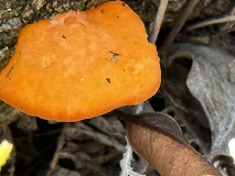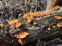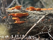このきのこはヒイロタケ(緋色茸)と思われます。子実体は扁平な傘型で固く、基部で材にしっかりと固着しています。全体が鮮やかな緋色(やや黄色みのある鮮やかな赤)から朱紅色のキノコです。傘は半円形から円形、幅は3~10cmです。 風雨にさらされると表面の鮮やかな色は退色し、灰色となるようです。直射日光にさらされた場所の材木でも旺盛に生育します。広葉樹(まれに針葉樹)の枯木に発生します。日本国内では平地に広く見られます。