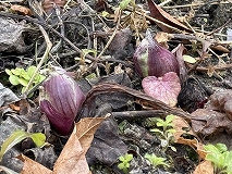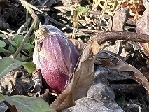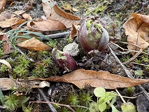これはフキノトウ(蕗の薹)と思われます。フキの早春の花茎をフキノトウといいます。フキノトウは株が異なる雌雄異花です。鱗状の苞葉で包まれており、茎先に散房状に密についた多数の頭花があります。花期は早春の3 ~5月頃です。フキノトウは蕾の状態で採取され、新鮮なものはほろ苦い味と、特有の香りが春の味覚として好まれているようです。山野に生える春の山菜としてよく知られています。旬は早春(2月 ~3月)です。