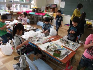 あさがおのつるで作ったリースにどんぐりやまつぼっくり、つばきの実などを飾って、秋のリースを作りました。ボンドで木の実をつけるのは、なかなかうまくできなくて大変でしたが、根気よく取り組むことができました。赤い木の実をつけて飾ったり、絵の具で彩色したりしました。リボンやビーズで飾る子もいました。どのリースもとっても素敵に仕上がりました。 |