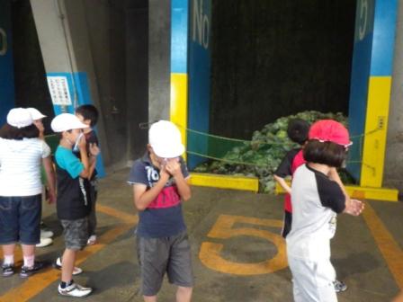 水沢浄水場の次はふれあい牧場で搾乳体験をしました。初めて体験する子がほとんどでした。みな、こわごわと牛のそばへ近寄り、そっとお乳の出るところをにぎって乳しぼりをしていました。昼食のあとアイスクリームを食べて、次の見学地へ出発しました。 |