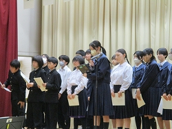 今回は音楽部+有志生徒による発表となり、総勢20名の参加。13時から30分間、校歌を含む3曲を披露しました。その中に部長のあいさつで笑いあり、桜中クイズあり(難問も有)で観客参加型の発表となりました。最後の顧問の先生からの部員を想う熱いお話もあって会場は盛り上がました。