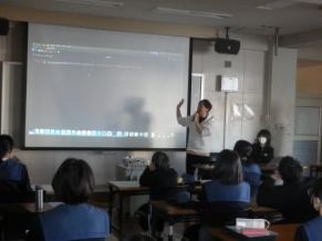 1年生英語では教頭先生との授業です。技術科の先生の自己紹介を聞いて、先生を紹介する文章をつくることが今後のミッションです。ニコニコの教頭先生と生徒のみなさんとのやり取りがよかったです。