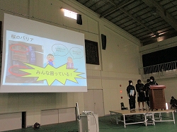 体育館の作品展示では、本校のつなぐプロジェクトの写真やものづくり部の作品が展示されていました。地域の方々も「上手だね」「これ新聞でみた」などおっしゃっていました。また、女性防災士の桜ずきんちゃんのブースでは、桜中で取り組んだ防災学習の様子も紹介されていました。