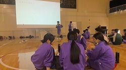 続いて、薬物乱用防止教室です。学校薬剤師の先生から、薬剤師の仕事についてやカフェイン摂取のこと、薬を飲むときのよくある質問などクイズを交えてのお話がありました。薬は決められた回数と時間を守って正しく服用すること、違法薬物には絶対に手を出さないこと、そして市販薬のオーバードーズの危険性や現状を教えていただきました。