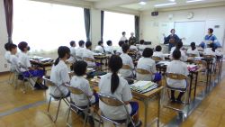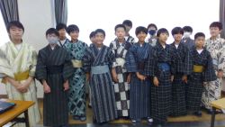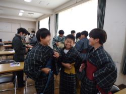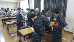 本日、家庭科の時間に視聴覚室で、日本和装の方による浴衣の着付けの出前授業が行われました。