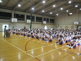 校長先生からは、4月始業式で話をしたキーワード「時間・あいさつ・掃除」「Just  do  it!」について振り返りが行われました。各学年リーダー会の取り組みによる活動の様子、地域の方によるお褒めの言葉、授業やテストに真剣に取り組む姿、先日行われた学習発表会での様子、行事での様子などが紹介され、生徒のみなさんの成長を評価していただきました。