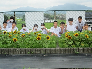 1学期に、PTA環境部の「ひまわりプロジェクト」が行われました。PTA環境部の方以外にも、地域の方、保護者、生徒などたくさんの方に協力していただきました。3年生の外掃除でも、草抜きなどをこまめに行いました。1学期の最後、咲きそろったひまわりと一緒に、外掃除メンバーが写真を撮りました!