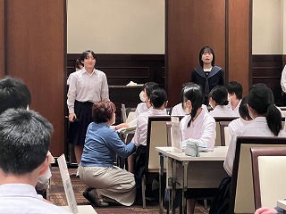 生徒代表による花束贈呈後、離任される音楽の先生の最後のピアノ伴奏校歌を合唱しました。