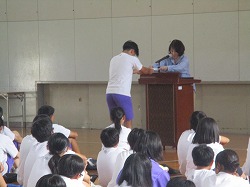 修了式の前にいじめ標語の入選と柔道大会の表彰伝達式を行いました。