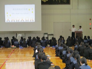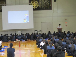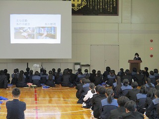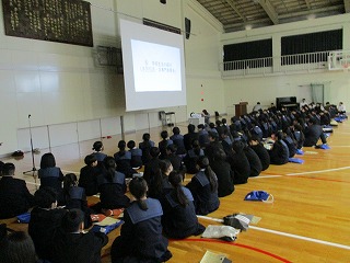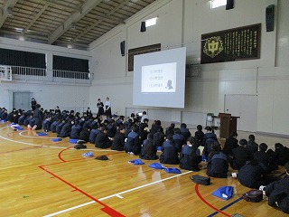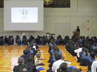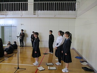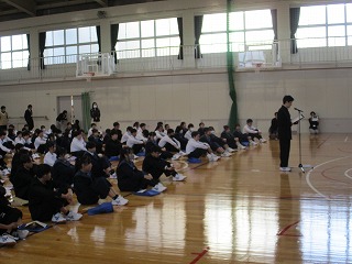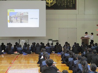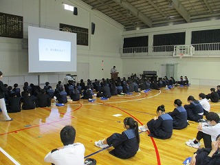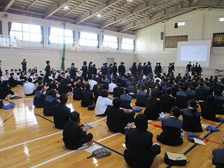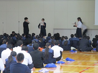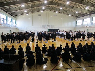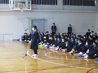 生徒会が主催して、令和8年度対面式が行われました。昨日の始業式は2・3年生のみ、入学式は1年生のみで行われましたので、新入生と2・3年生が一緒に活動するのは今回が最初です。生徒会長の話から始まり、生徒会役員や専門委員長などがすべてを仕切って1時間30分ほどの式を開催しました。