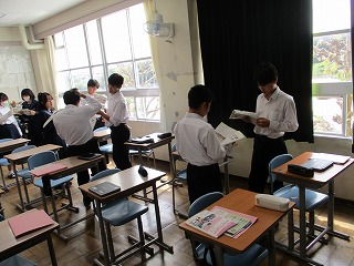 英語科の授業では英会話の基礎として、教科書の本文を使って会話文を音読することで模擬英会話をしています。語学は習うより慣れろと言われます。繰り返しトレーニングすることで英語の発信力を身に着けていきます。