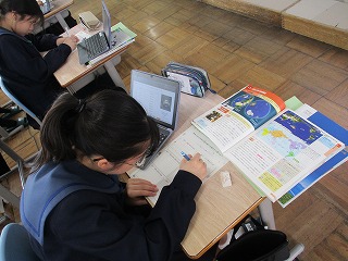 1年生の社会も地理。こちらは世界地理を学習しています。世界中の様々な国の特徴を見つけることが課題のようです。視点を決めて考えを深める学習方法を学んでいます。