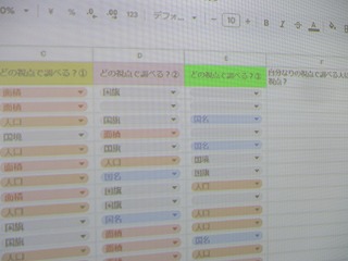 ICTを活用して進める学習方法の利点の一つは、同時双方向性だと考えます。自分の席に着きながら、スプレッドシートを使って、教室内のなかまが何を今考え取り組んでいるのかを瞬時に情報交換できます。個別最適に学習を進めながら、協働的に学習を進めるためのアイテムだと思います。この情報交換を参考にして自分の考えも深めていきたいですね。