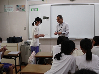 つなぐプロジェクトメンバーが放課後視聴覚室に集合しました。桜連合自治会の倉庫に絵を描いてくれているお礼にと、地域から8月17日(土)桜連合の夏祭りの招待券が届きました。教育相談員で地域の方である神谷さんから、メンバー一人ひとりに招待状が手渡されました。受け取った後、みんなの顔がほころんでいました。最後に、メンバー全員でお礼を言いました。ありがとうございました。