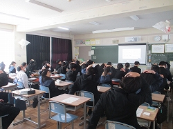 続いて、薬物乱用防止教室です。学校薬剤師の先生から、薬剤師の仕事についてやカフェイン摂取のこと、薬を飲むときのよくある質問などクイズを交えてのお話がありました。薬は決められた回数と時間を守って正しく服用すること、違法薬物には絶対に手を出さないこと、そして市販薬のオーバードーズの危険性や現状を教えていただきました。