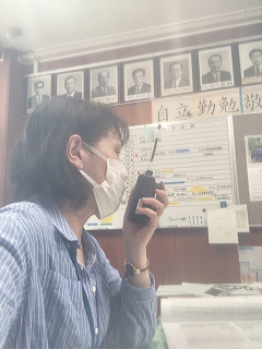 本日は桜地区自主防災協議会のご協力を得て、トランシーバーを使い、桜中校長室、桜中防災倉庫、桜小防災倉庫と桜地区市民センターの4カ所を結んで、情報をやり取りする練習も行いました。