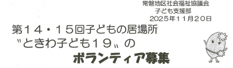 ただ今、第14・15回子どもの居場所「ときわ子ども19」のボランティアスタッフを募集しています。
