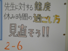 各学級からの発表に対し、まずは各学級に向けて1つ1つ具体的な事例をあげながら、2年生として成長したところや課題についてお話しいただきました。そして、最後に「自分たちの学級の目標だけでなく、他の学級の目標や改善点も学年全体として大切にしてほしい」とまとめていただきました。