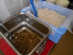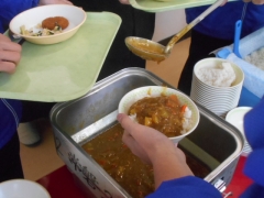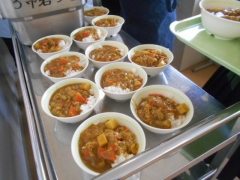 本日のSDGsメニューのポイントは、配膳の仕方がいつもと違うことです。どんぶりにご飯とカレーを一緒に盛り付けることで使用する食器を減らし、洗い物に必要な水やエネルギーを節約できるアイデアです。また、地産地消は輸送時の排出ガスを減らし地球温暖化対策となります。お家でも出来そうなアイデアですね。