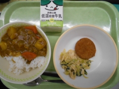 本日の学校給食週間メニューは、三重豚カレーライス、メンチカツ、三重のたけのこサラダ、牛乳です。