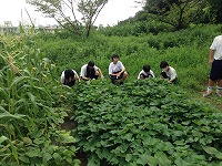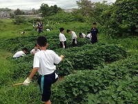 夏休みに1年生が育てているサツマイモの農園作業を行っています。