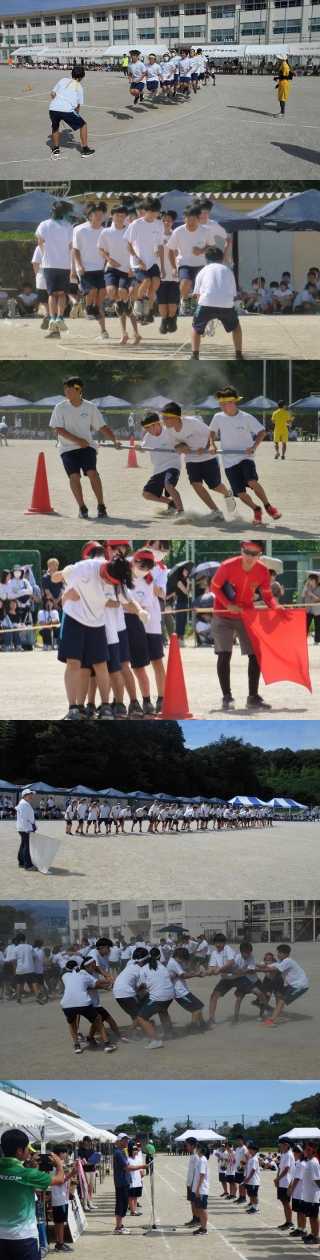 小集団種目の大縄跳び・生徒会種目(安心してください。借りられますよ)では、各クラス協力して頑張っている姿が見られました。また、学年種目では、1年生:台風の目、2年生:むかで競走、3年生:棒引きが行われ熱戦が繰り広げられるとともに、一生懸命応援をしていました。9月下旬ではありますが、30度を越える中、熱中症予防として、クーリングタイムを挟みつつ、生徒の生き生きとした姿がとても印象的でした。