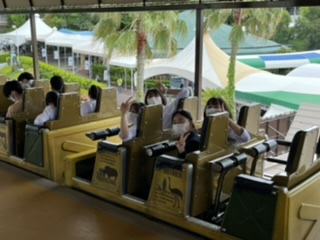 集合写真の撮影時は雨でしたが、解散した時には雨がやみアトラクションにも乗れています。また、動物園や水族館で動物たちとふれあっています。
