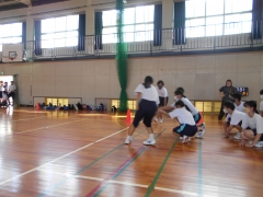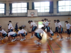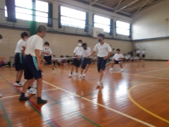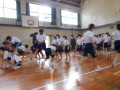 天気は回復していますが、グラウンドの状況が悪いため、体育館での学年練習となりました。密をさけるため、2クラスずつの練習をしました。
