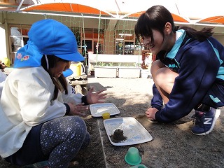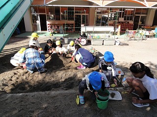 砂場では思い思いの創作。園児の遊びに合わせて行動。