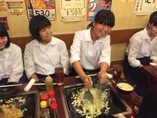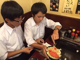 夕食はもんじゃ焼きです。 1組 おしお本店でもんじゃスタートです。初めてのようですが、上手に焼いています。