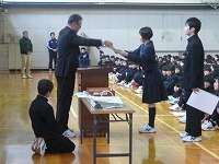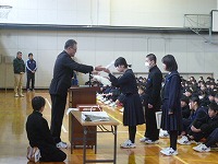 本日1月23日(土)の3限目に生徒集会を行いました。男子テニス部や剣道部をはじめとするたくさんの部活の大会結果の表彰や優秀選手の表彰が行われました。また、人権作文など文化的な面での活躍を示す表彰も行われました。その後、生徒会のよる取り組み報告と各委員会報告が行われました。