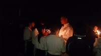火の神に扮した生徒代表が生徒全員で作った円内をゆっくり回り、営火長(校長先生)に火を分火しました。