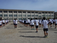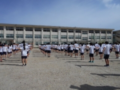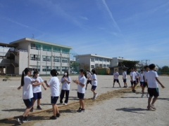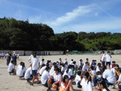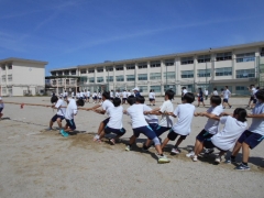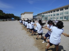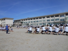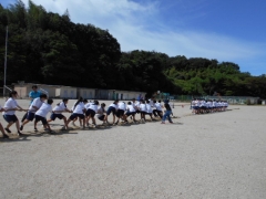 今日は、ラジオ体操、全員リレー、学年種目の綱引きを行いました。
