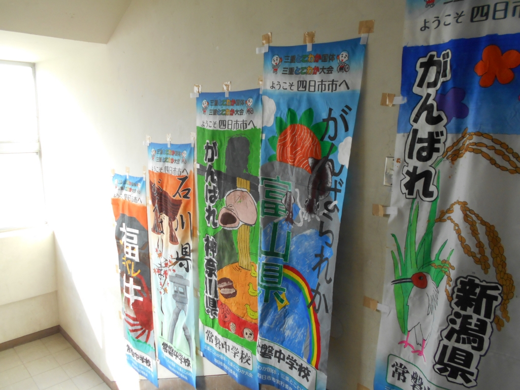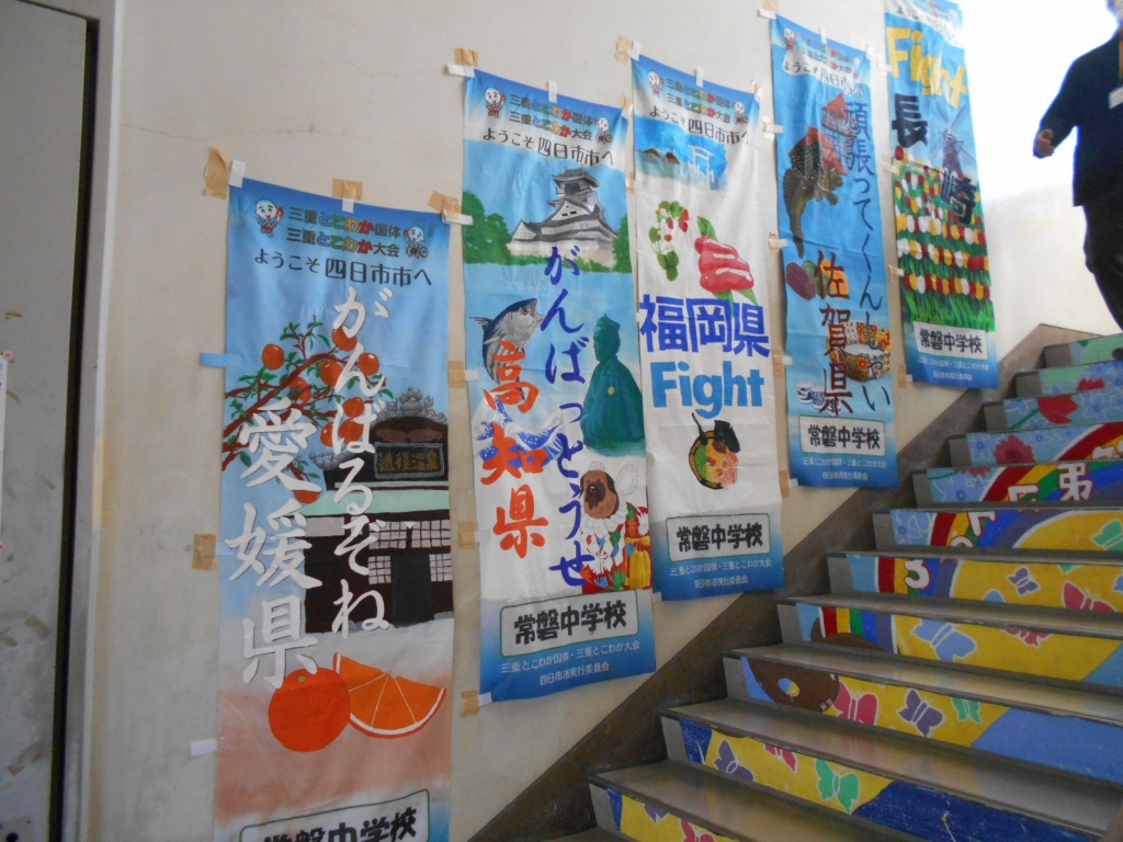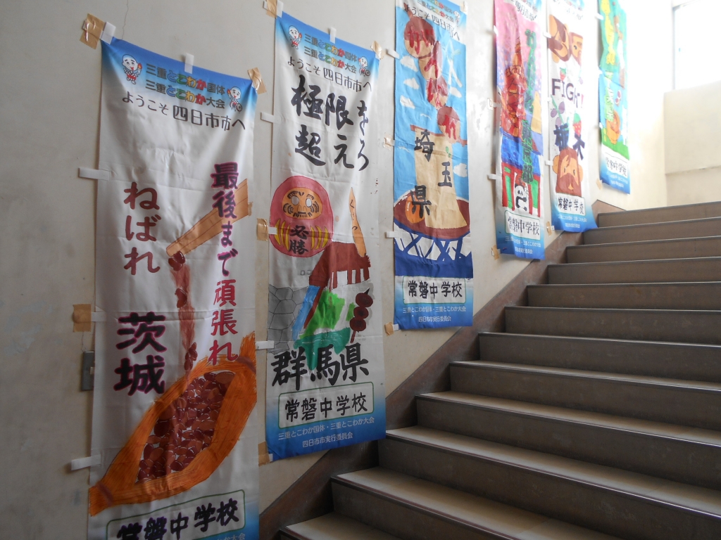 また、特別棟の階段には日の目を浴びることのできなかった三重国体の都道府県応援のぼり旗を展示しました。
