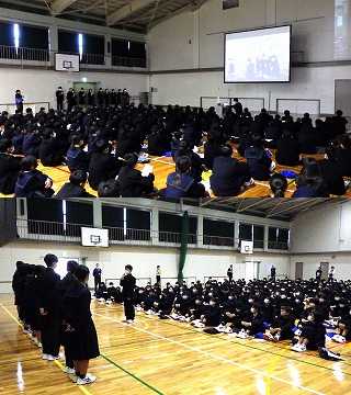 常磐中では生徒会執行部が在校生を代表して1年生と対面式を行なっています。1枚目の写真は、生徒会執行部による自己紹介の後で常磐中学校での生活の様子やいろいろな決まりを執行部出演のわかりやすい動画で説明しているところです。2枚目の写真は式の最後に1年生の代表がこれからよろしくお願いしますと挨拶をしているところです。