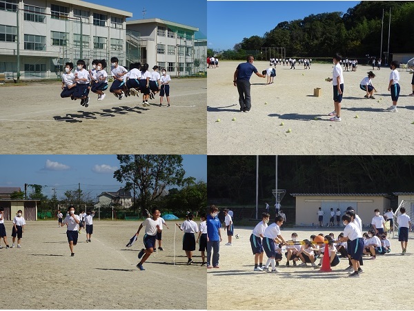 10月14日(木)開催の体育祭に向けて、各学年、体育祭の練習が始まっています。今年度も規模を縮小しての開催となるため、多くの時間を保健体育の授業を中心に行います。今年度は、「全員リレー」と「学年種目」の他に1学年3つに分かれての「小集団種目」(1人1種目)も行います。生徒の皆さんは、約1か月以上部活動も行っていないので、ケガに気を付けて徐々に全力で運動できるよう体を慣らしていってほしいと思います。写真は、本日5限目の1・2年生の体育の授業です。