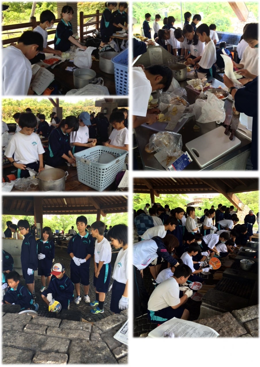 野外炊さんが始まりました。協力してカレーライスを作っています。