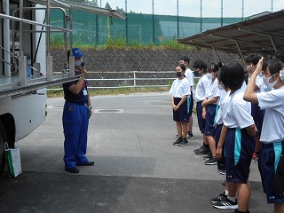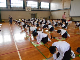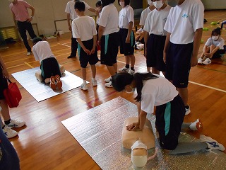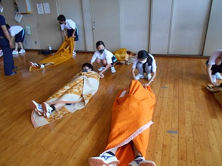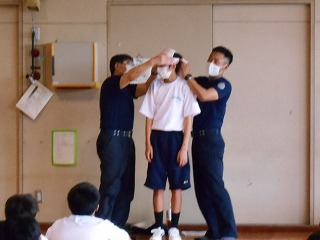 今日の流れとしては、地震が起きる前にどうするかということで、基本的な防災・減災についての話があり、実際に大地震が近づいてきていることを実感しました。地震が起きた時にどうするかということで、起震車に乗って体験を行いました。そのあと、ケガなどで負傷したときにどうするかということで、止血・搬送について、救急蘇生法について学習しました。