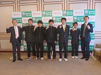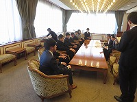 香川県高松市で行われる全国大会に出場するテニス部男子のキャプテの伊藤 響さん、副キャプテンの廣瀬 晃也さん、田嶋 凜太郎さんの3人が市長表敬訪問として、市役所8階の応接室を訪問しました。