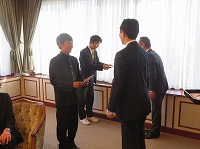 副市長さん・副議長さんからは懇談のあと、温かいメッセージをいただきました。テニス部男子の皆さんは、常磐中学校の生徒として、また、三重県・東海地区の代表として頑張ってきてほしいと思います。