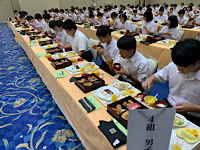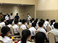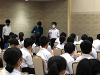 ホテルに到着してすぐに夕食です。朝に出発式ができなかったので、校長先生からの話と実行委員長からの話がありました。1日目の注意点もありました。