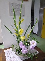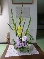 きれいな花を活けていただきました。 いつもありがとうございます。 グラジオラス(黄) トルコキキョウ(紫) ソケイ