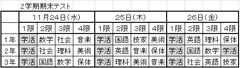 テストの予定は、以下の通りです。生徒の皆さんにはしっかり取り組んで、2学期の学習の成果が出せるよう頑張ってください。