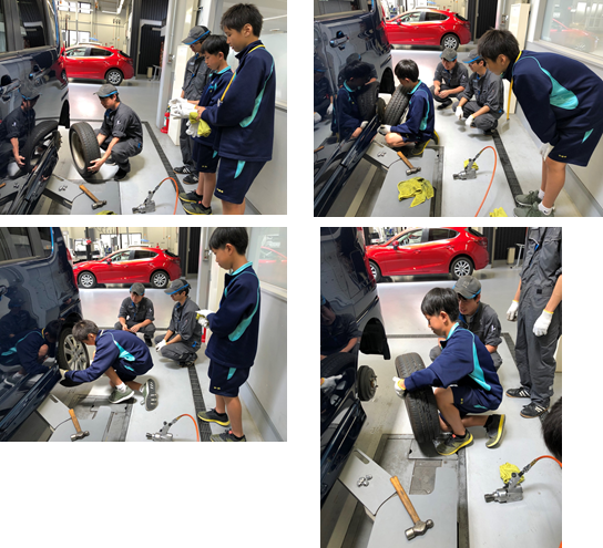 東海マツダではタイヤの取り付け作業の手伝いを、日産プリンスでは車の拭き上げをしていました。みんな一生懸命頑張っていました。