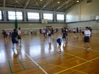 例年は川越中学校で行っているスポーツ教室ですが、今年度は改修工事のため、常磐中学校で行いました。狭い体育館ですが、川越中学校と常磐中学校の生徒約70名が参加しました。講師は日本バドミントン協会小学生連盟理事長の森下さと子コーチです。