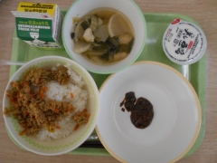 本日のメニューは、ツナ丼、牛乳、豆腐の肉みそがけ、地物いっぱいすまし汁です。