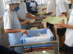 三重県産の食べ物は、米、牛乳、豆腐、豚肉、みそ、油あげ、しいたけ、小松菜、青ネギの9種類で、「豆腐の肉みそがけ」は、三重県産の大豆で作られた豆腐にかけていただきます。